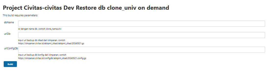 Untuk restore & create db clone (port 3308/3339) bisa menggunakan pipeline ini melalui url https://jenkins.civitas.id/job/Civitas-civitas Dev Restore db clone_univ on demand/